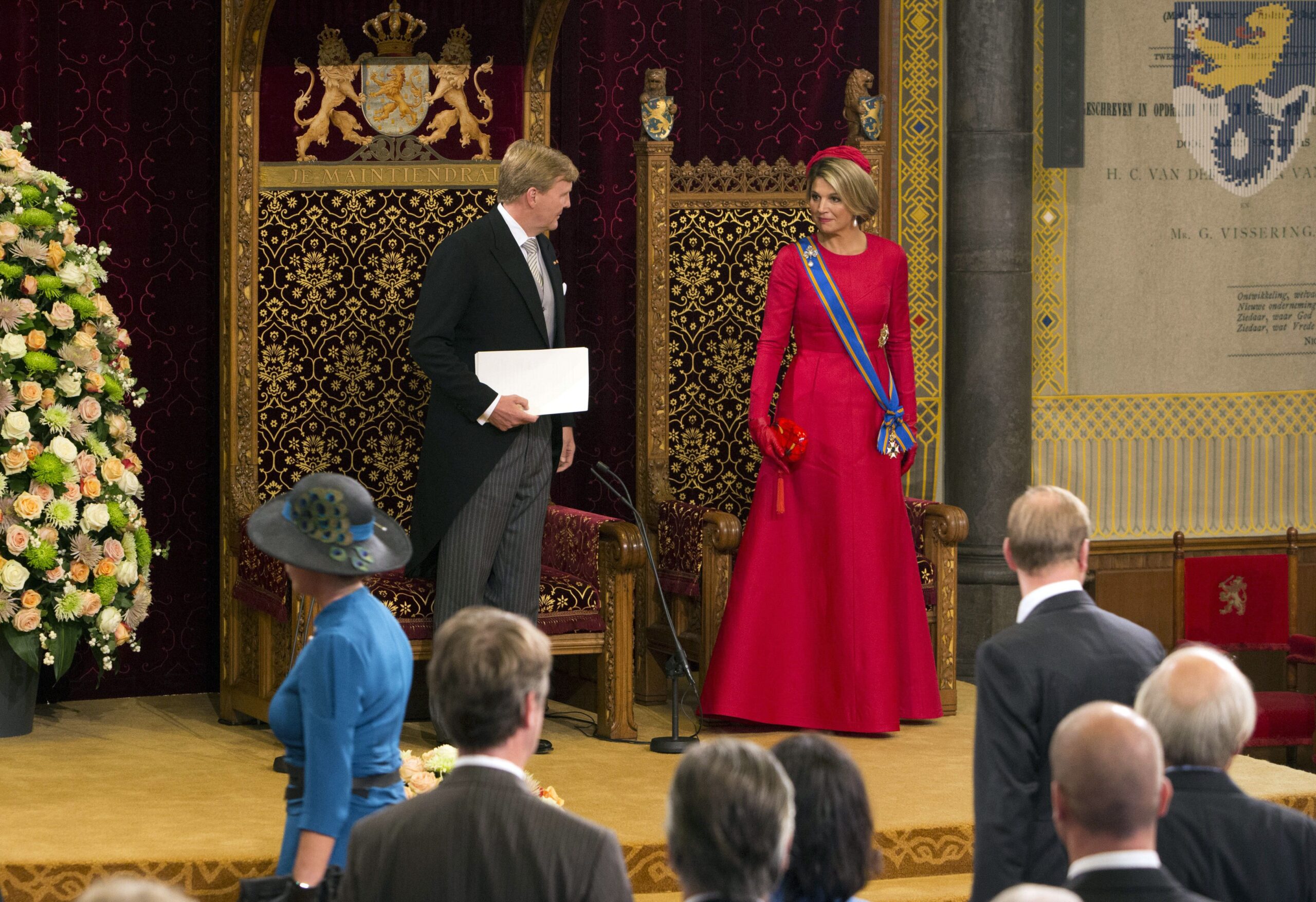 King Willem-Alexander addresses the Dutch Senate and House of Representatives from the throne in the Hall of Knights next to Queen Maxima, on September 16, 2014 in The Hague, the Netherlands.